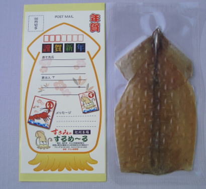 スルメイカが定形郵便になったもの。和歌山県のすさみで捕れたスルメイカを干し、真空パックにしたもので、定形郵便物として送れるものだそうです(1枚230円、90円切手を貼って送れるようです)。