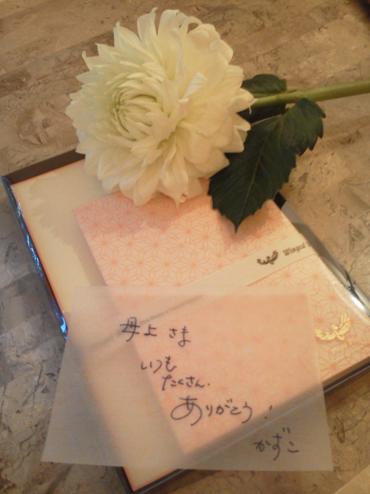 実際には、もうちょっと諸事情についてきちんと書いたレターを渡すつもりでいるのですが、写真のメッセージカードだけで喜んでもらえたので、さて、どうしましょ。書くのやめちゃおうかなぁ~(笑)。