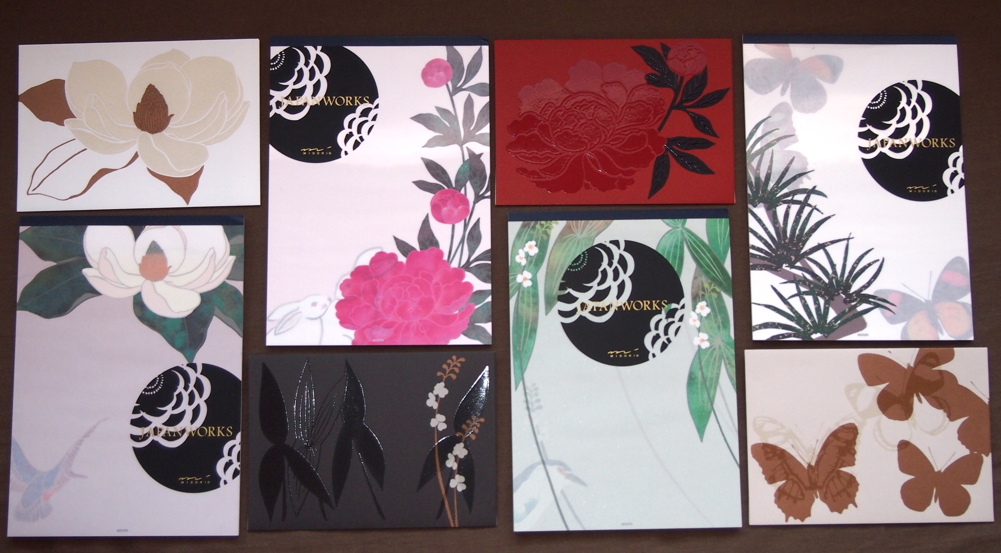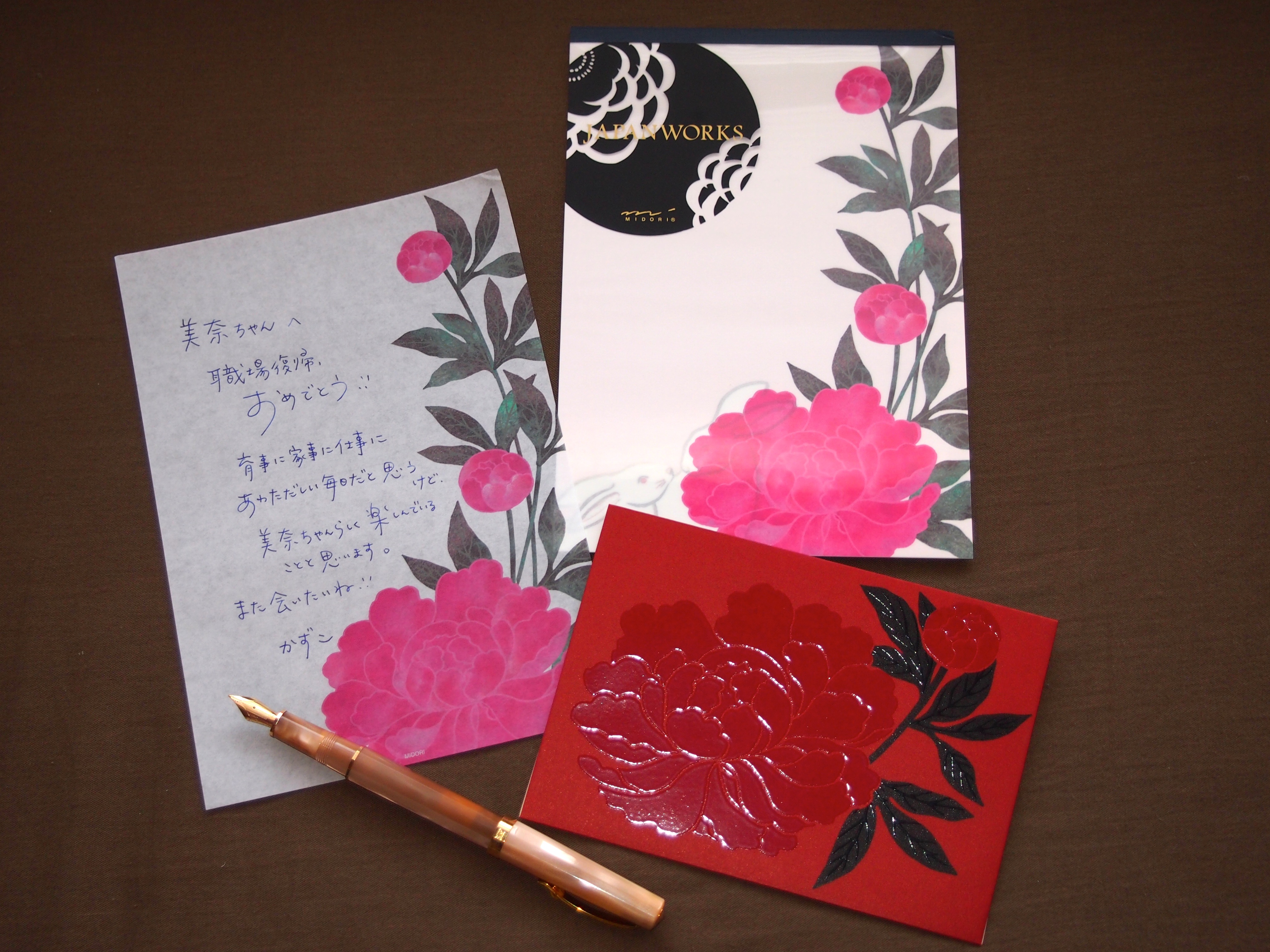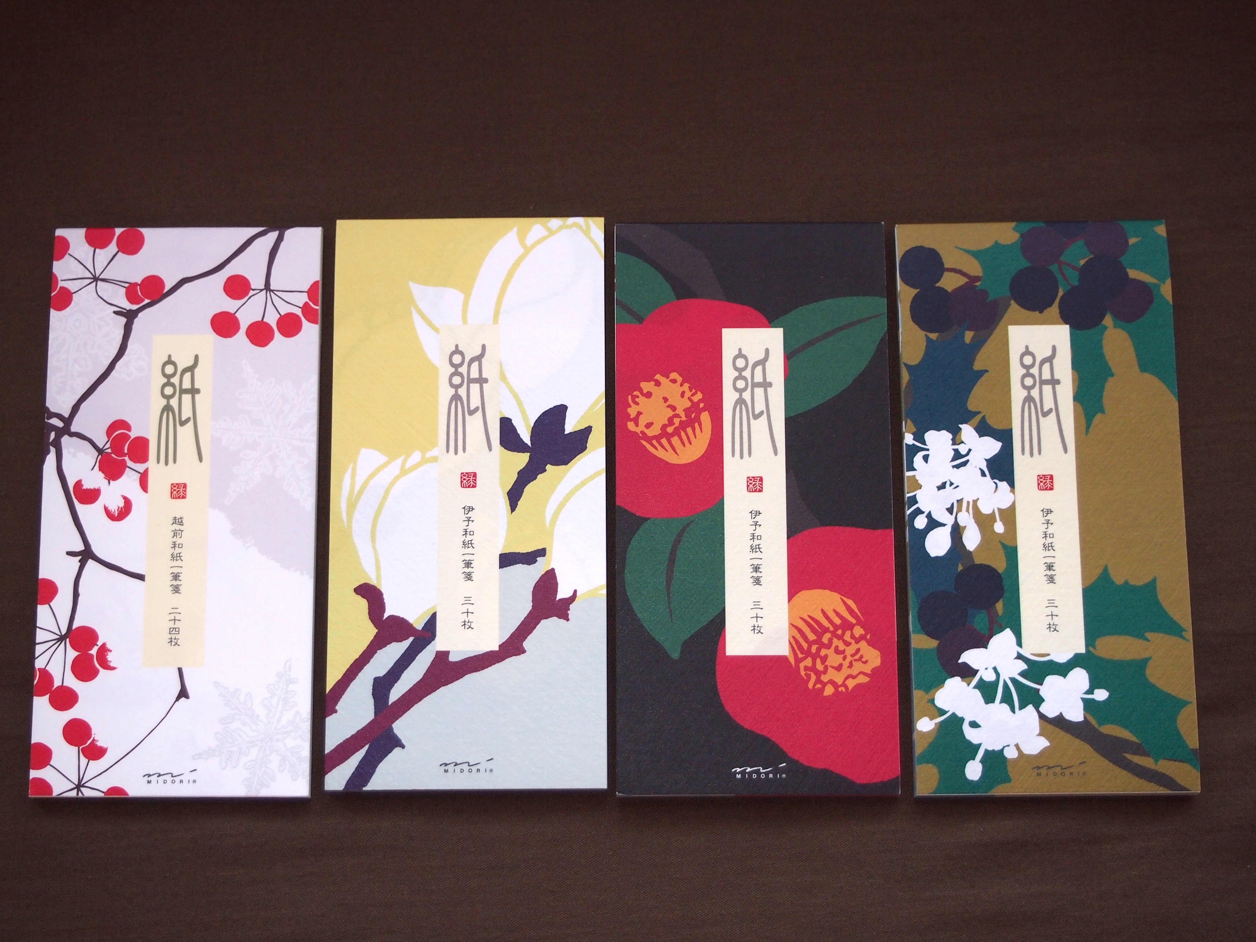 下の段の左から2番目、ハートリボンのそえぶみ箋は、売上の一部が東日本大震災の義捐金になるそうですよ(下の段の4つは古川紙工のものです。上の段は左からデザインフィル ミドリカンパニー、日本ホールマーク、ウイングド・ウィールのものです)。