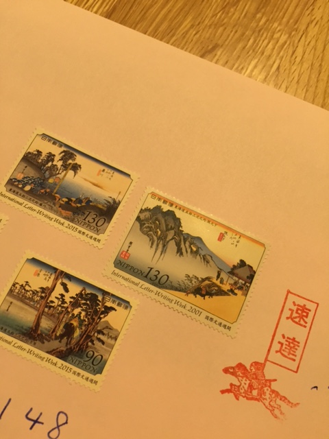■ 速達便で出したいときは、歌川広重の東海道五十三次の記念切手を使っています。写真のハンコを使いたいから!(笑) 京都の、知る人ぞ知る印鑑店/田丸印房で買ったものです。