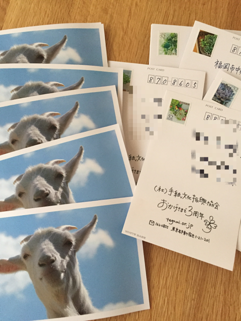 ■ ヤギのポストカードいっぱい! 当協会の認定講師・鈴木真衣子さんに宛て名を書いてもらって、たくさん発送しました。鈴木さんは書家でもあるので、宛名を書くスピードも驚くほど早いです。「慣れ」というものは、やはり強いですね。