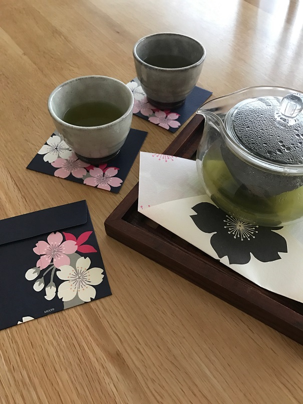 ■ ポチ袋のちょっと贅沢な使い方。ミドリの紙シリーズのポチ袋をコースター代わりに。急須の下に敷いているのも、紙シリーズの便せんです。