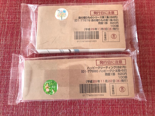 切手シート100枚の束、2つ。なかなかお目にかかれませんよね!? 年末に購入したもので、わたしもこのとき初めて見ました。