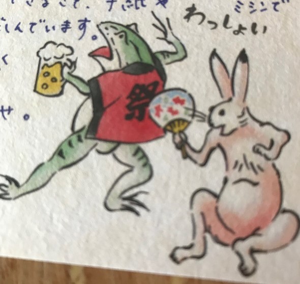 ビールを飲むカエルさん。どこまでもアレンジできる鳥獣戯画はほんとに魅力的。