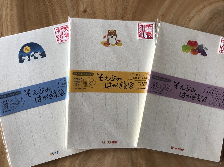 ■ 監修しています、そえぶみはがき箋(美濃和紙・古川紙工社製)、秋の新柄3種。そろそろ店頭に並ぶ頃でしょう。左の「月うさぎ」柄や右の「秋のくだもの」柄は今からもう使えますね。