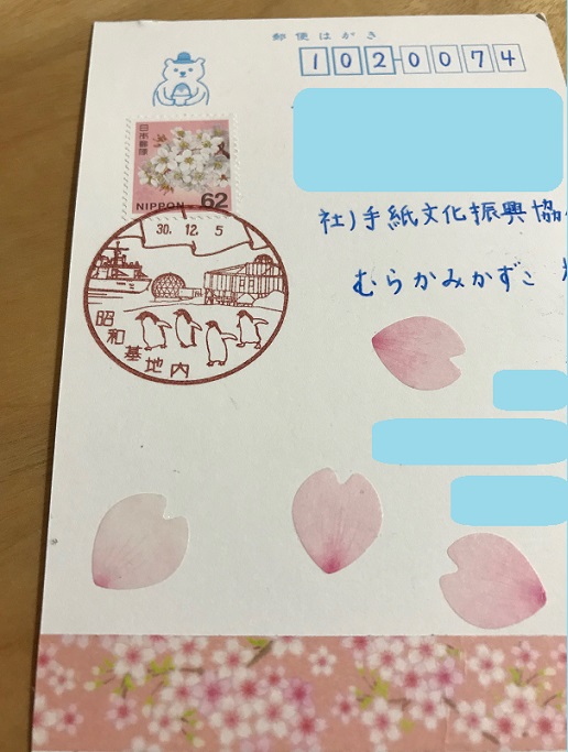 書いてくれた日付が平成30年10月。昭和基地内郵便局の消印が30年12月5日。受け取ったのがつい先日。およそ半年かけて地球をぐるっと半周、旅してきたハガキです。