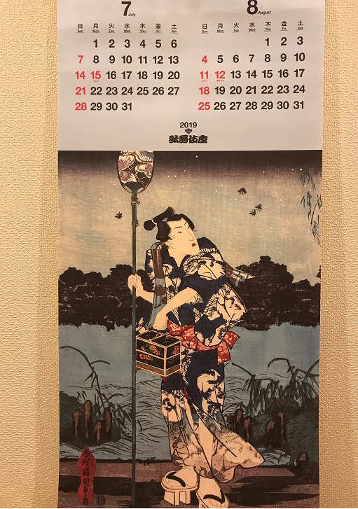 男性が手にしているのは団扇と小箱ですね。団扇で蛍をつかまえて小箱に入れて持ち帰るのでしょう。