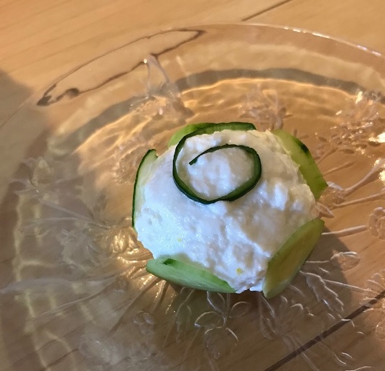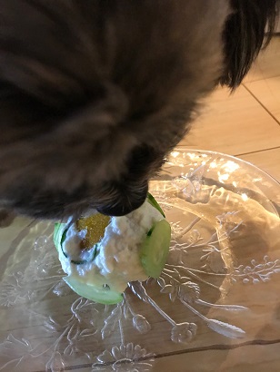 かぼちゃをつぶして丸め、水切りしたヨーグルトでコーティングし、キュウリで飾りをつけました。ほぼ6歳です。