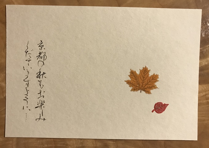 こちらも当協会の講師から届いた1枚です。流暢な文字が川の流れのよう。そして、何気ないようで、ちょこんと貼られたシールから秋を感じます。