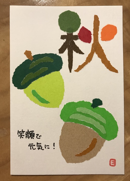 ちぎり絵はがき、シールでも秋を表現