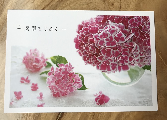 かつて紫陽花といえば日陰の花のイメージがありましたが、最近は上のカードにあるような主役感のあるゴージャスな紫陽花も見かけますね。