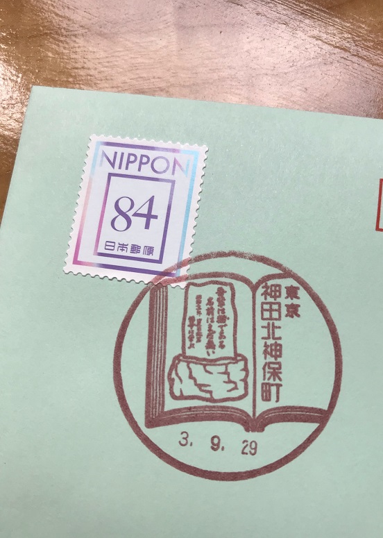 東京・神田北神保町郵便局の風景印。よく見ると、本と、夏目漱石の石碑が描かれています。
