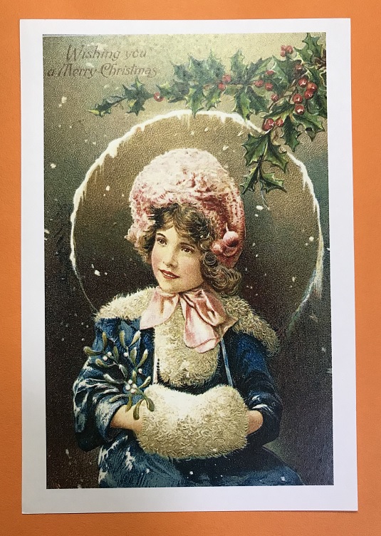 上のポストカードの左の女の子、こちらは白い実ですね。葉もギザギザしていません。よく見ると、下のポストカードの女の子の右腕にも同じ植物が描かれています。うーむ、なんという植物でしょう...?  気になります。