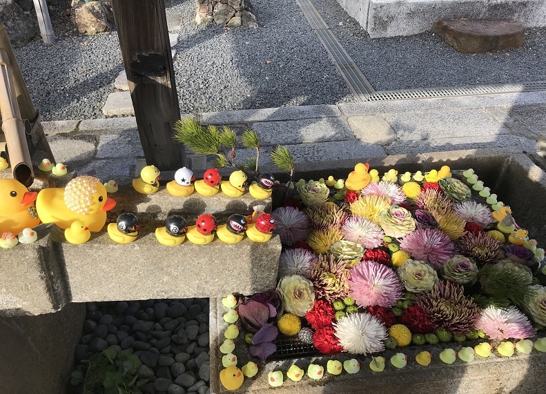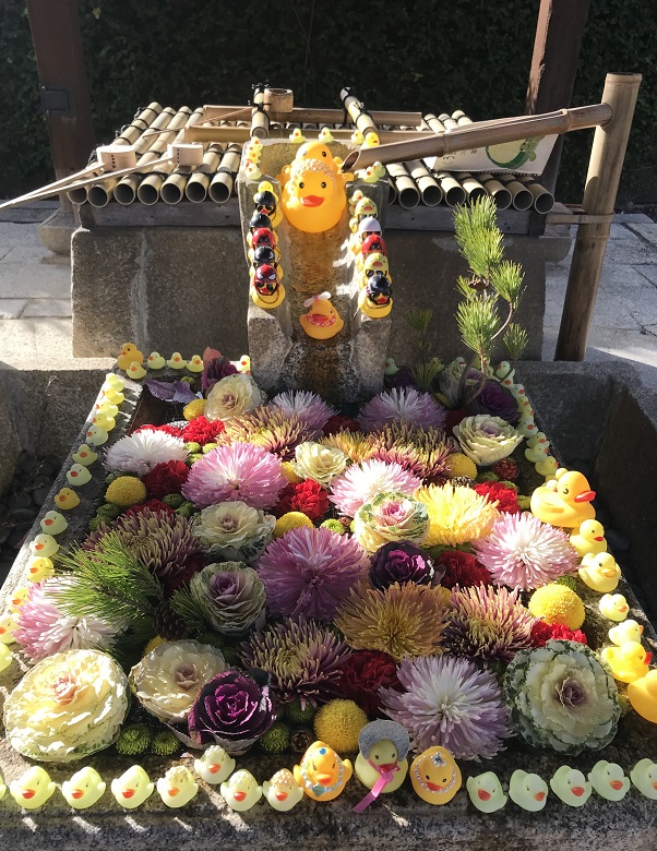 金戒光明寺(京都市左京区)の手水には立派なお花たちに混じり、なぜかアヒルちゃんが!