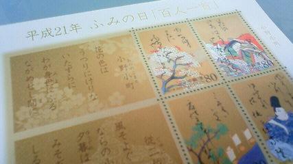 ちょうど今日は7月(文月)の23(ふみ)日、ふみの日です。 fuminohi.JPG ふみの日には毎年、記念切手が発売されます。 今年は昨年にひきつづき、百人一首シリーズとキティちゃんシリーズ。わたしは先ほど郵便局で買ってきましたよ。