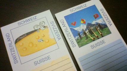 swiss.JPGネズミがチーズをかじっているイラスト、かわいいですね! アルプスの山々をバックに、アルプホルンを奏でている写真も、いかにもスイスらしくていい感じ。観光客向けの商品ですね。母も土産物店で購入したと言ってました。