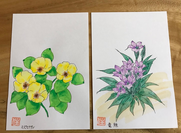 いずれもプレゼントしていただいたものです。カラーの筆ペンで描いたのでしょうね、こうした絵がささっと描けるっていいですね。