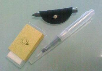 上は、芯えんぴつ皮カバーつき。えんぴつの芯の部分が、そのままえんぴつ本体になっているんです。左は、練り消しゴム。右は、水彩筆ペン。透明のところに水を入れて、絵の具をつけて使うんだそうです。
