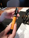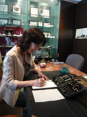 こちらはわたし。待っている間に憧れの1本、イタリアはデルタ社のドルチェビータを試し書きさせてもらいました。このあざやかなオレンジがたまらない~ @一応、昨日はガマンガマンしました。。^^;