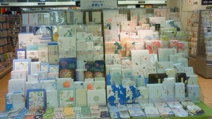 右の写真は、ロフトで撮影した夏の便箋コーナーの写真です。ずいぶんいろんな種類のものがあると、おわかりいただけますでしょう? この他に、通年で使える絵柄のものも、この倍くらいあります。