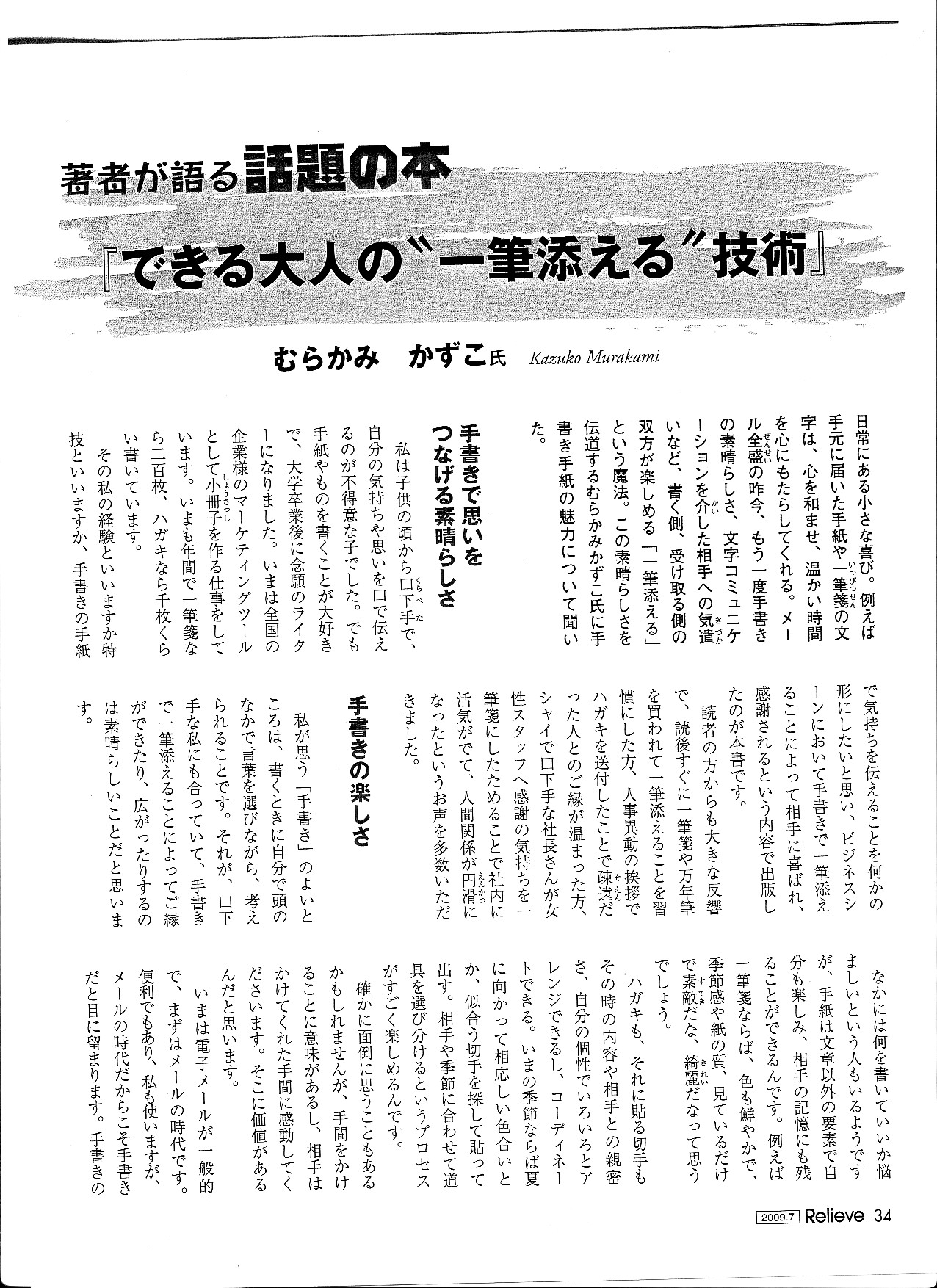 他に、最近では、雑誌『Relieve』7月号(株式会社アンリミテッドさん発行、出版文化社さん取材制作)に2ページにわたり、「話題の本」として記事掲載していただきました。ありがとうございます!