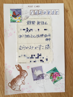 こちら(上と下)は、当協会の受講生から届いたハガキです。本の付録になってる出版記念の限定そえぶみ箋を使って、送ってくれました。うさぎモチーフにあわせて、ハンコやシールの使い方がとても上手! 表面の切手の貼り方も、春らしくて、何度も見てしまいます。