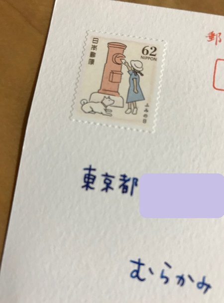 ■上記のふみの日切手(62円)で届いた、消印を捺しそびれたであろう貴重な1枚です。背伸びしてポストに手を伸ばす女の子の足元にワンコがいるのですね! お行儀よく待つ姿が可愛らしい。