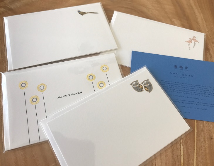 右に置いている拙著『たった3行のシンプル手紙術』(日経出版)は文庫本。つまり、左のジャバラの一筆箋は手のひらサイズです。日本橋・はいばらさんのものですね!