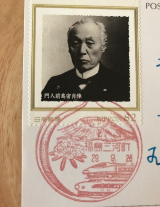 ■ 福島三河町郵便局の風景印。切手の人物は日本の郵便制度をつくった前島密氏です。